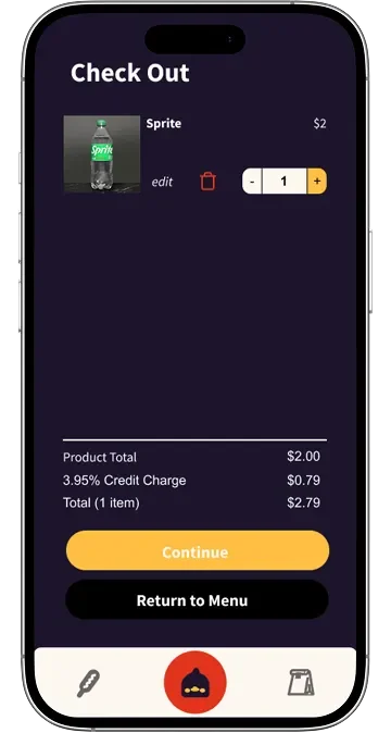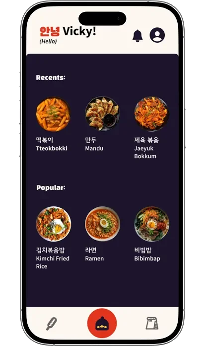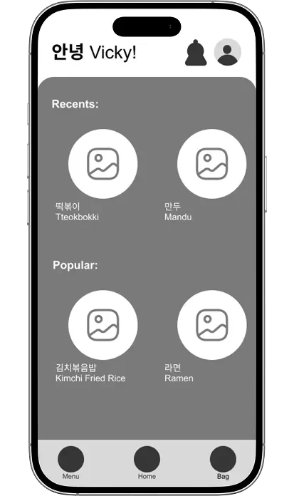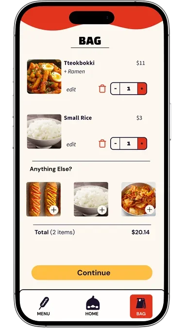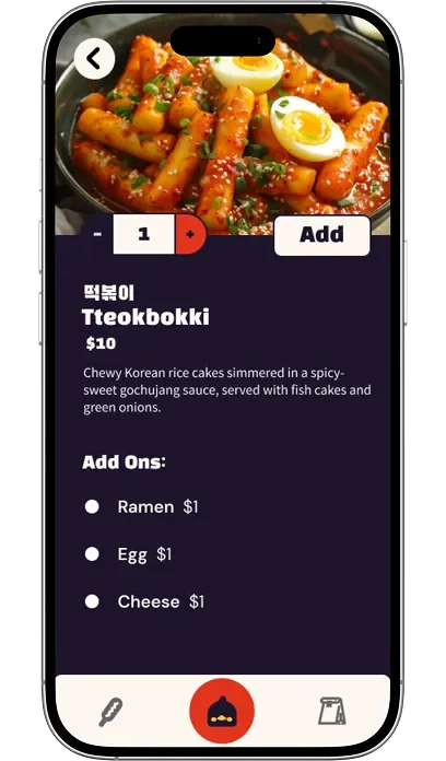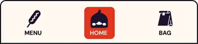 The navigation icons were intentionally designed to reflect Kami’s character and in-person experience. The Korean corn dog icon for Menu was inspired by user interviews at the truck, where multiple customers mentioned it as a favorite item. The duck icon for Home references a highly memorable part of Kami’s branding, and the paper bag icon for Bag mirrors how orders are handed to customers at the truck. While users appreciated the personality and uniqueness of these icons, usability testing revealed that their meaning was not always immediately clear. To address this, we added text labels to improve clarity without removing the branded visuals users responded positively to. We also updated the active state from a circular highlight to a square to better accommodate both icon and label, and introduced a dark border around the navigation bar to maintain separation as the interface shifted from dark to light backgrounds.