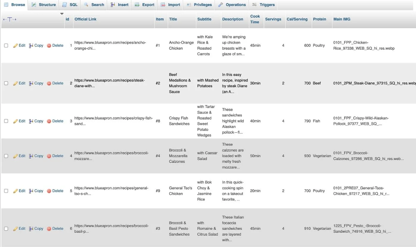 With the database successfully connected, I began testing how the recipe data would display onto each page. This became an iterative cycle where I adjusted PHP queries, refining how everything was being extracted, updating my phpMyAdmin data where needed, and styling each page to feel cohesive and readable. I also optimized all provided images and converted them to .webp, then updated my database to ensure the correct file paths were being pulled.