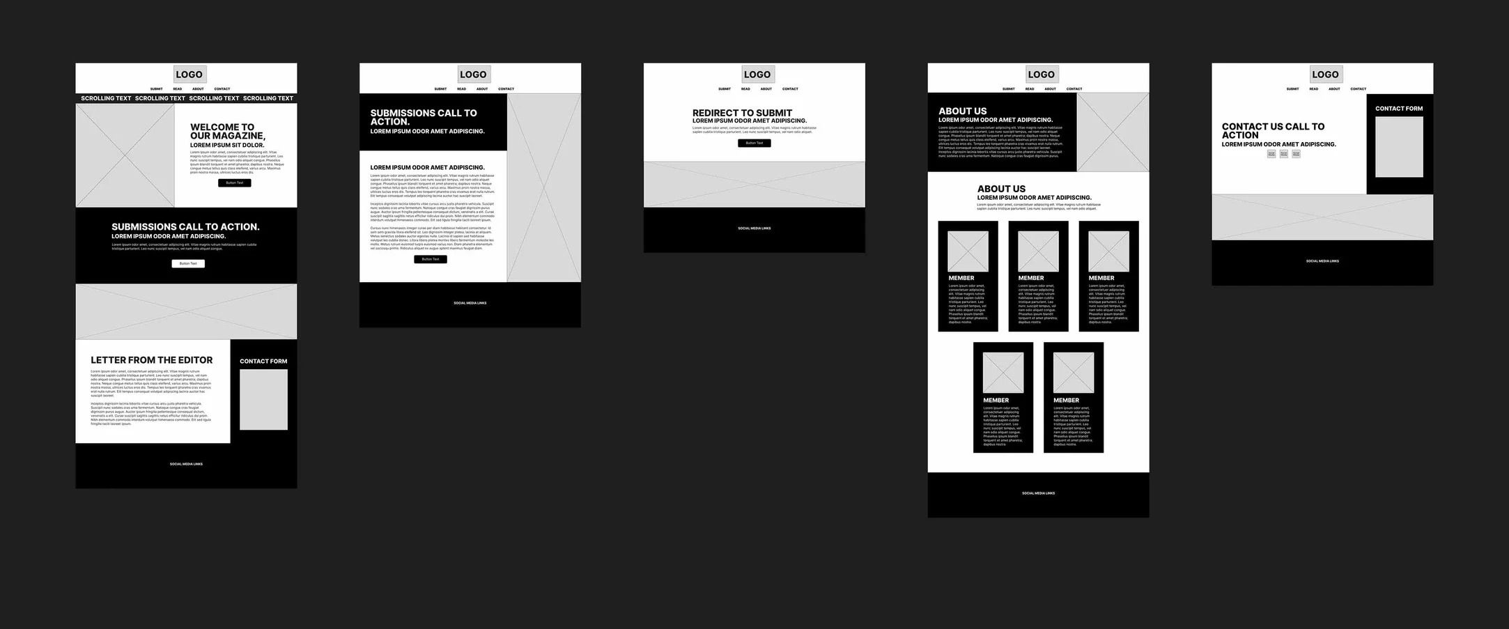 I created wireframes for key pages including the homepage, archive, submission form, about page, and events section. The website needed to be intuitive for both readers exploring content and artists submitting work.