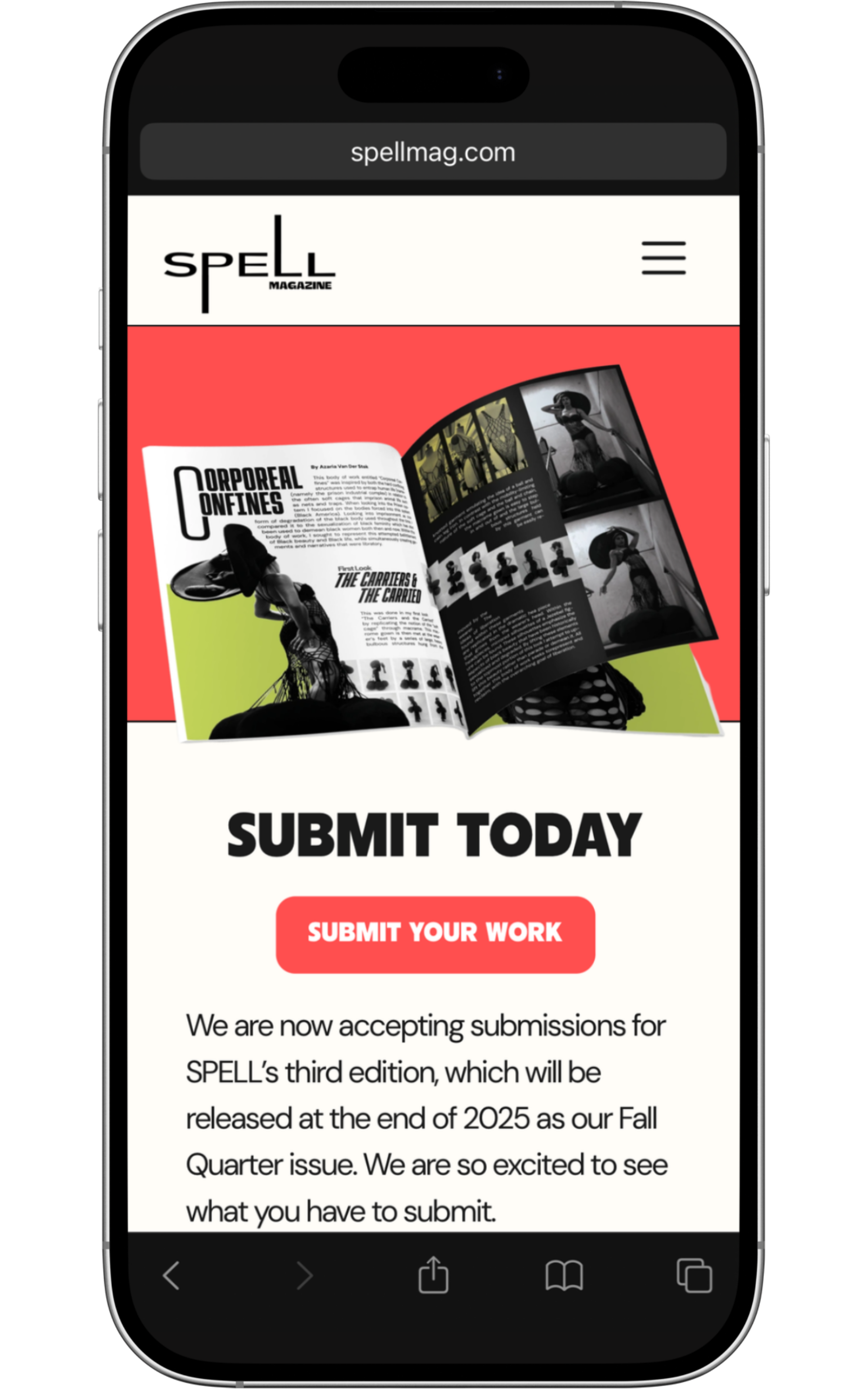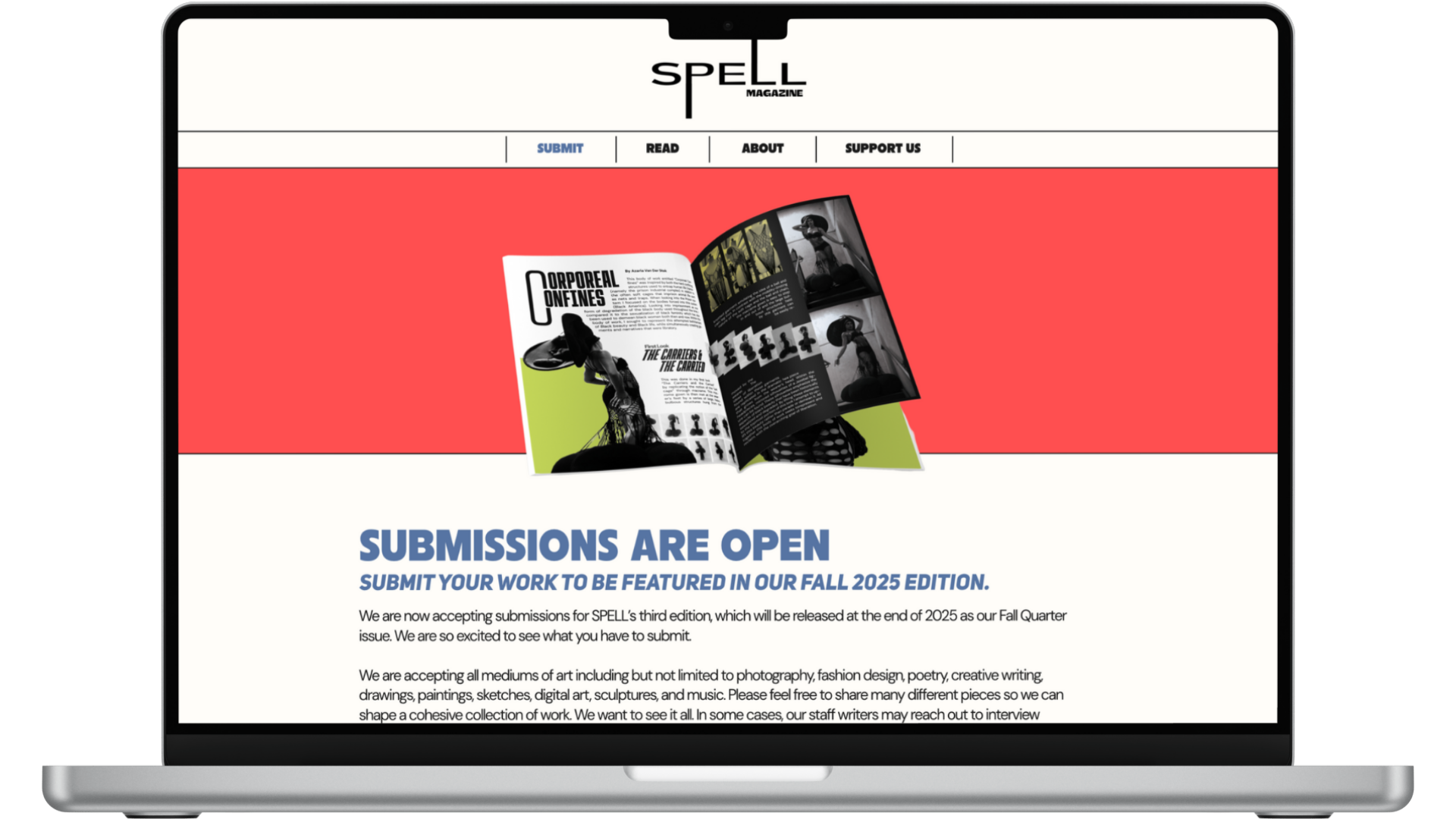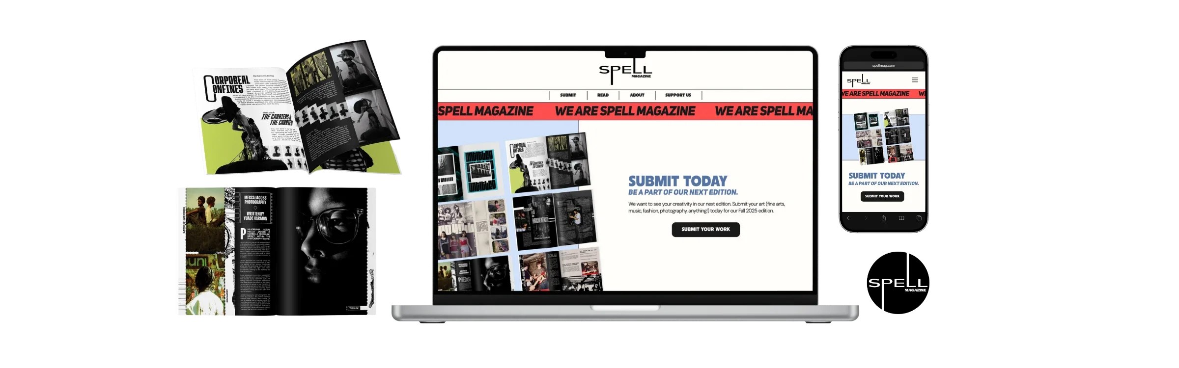Working with my Co-Creative Director, Drew Malizia, we developed the SPELL brand system to feel bold and accessible while maintaining professionalism. We extended this identity across all touchpoints, including the website, editorial layouts, and social media. Drew led the logo design and oversees our social media presence, while I lead the design and maintenance of the website. Together, we collaborate on new spreads, updated style sheets, and general creative direction to ensure the brand continues to grow cohesively across every platform.