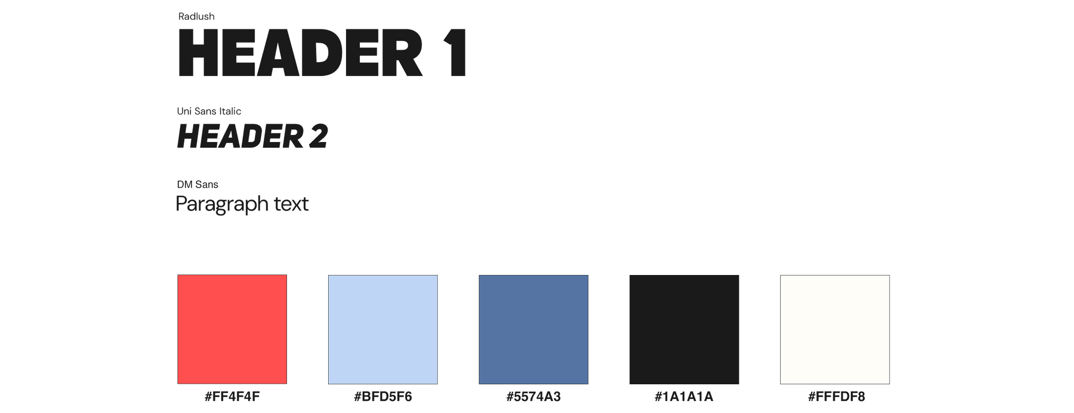 To maintain a newspaper-inspired vibe, I chose a neutral base with pops of color. A strong dark tone mimics traditional newspaper print for text and backgrounds, while a vibrant pink-red highlights important elements and adds energy. Blue tones provide balance and cool contrast, and a soft off-white creates a clean feel that's easy on the eyes.