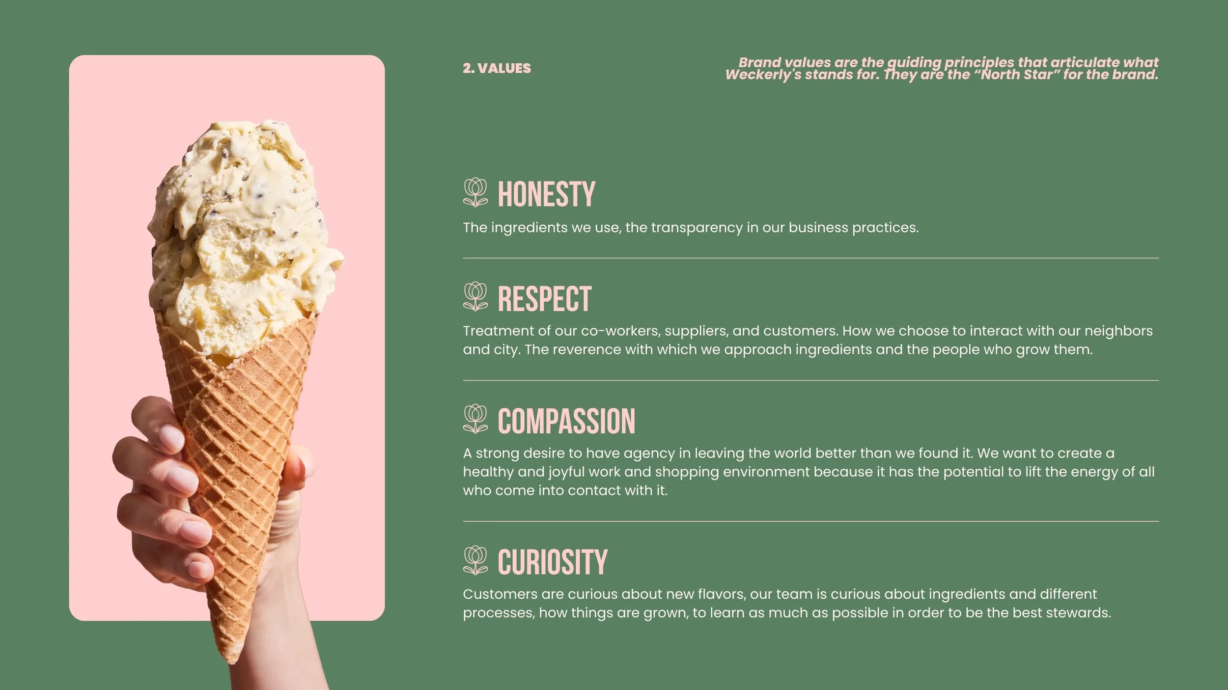I began the rebrand by updating Weckerly’s brand guidelines, starting with the foundational elements that define the brand’s voice and purpose. These include the mission, values, promise, purpose and position, and essence and personality. Each was reviewed and refined to ensure it aligned with where the company is today and where it is heading. The document was designed and formatted to visually represent the brand’s personality through color use, layout, and tone.