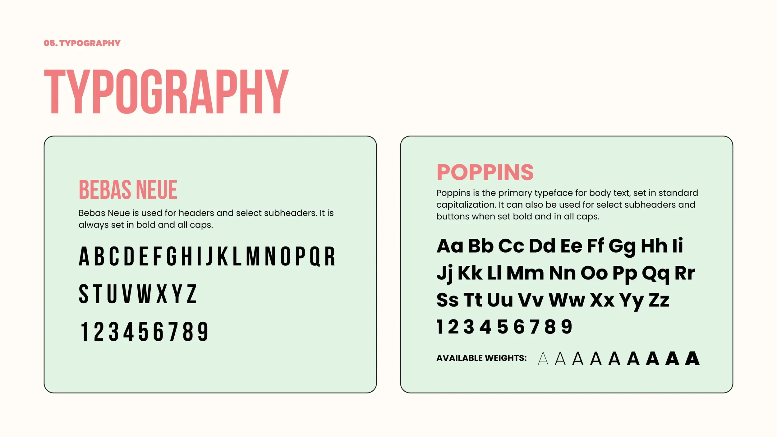 Poppins: For body text and small accents, used in standard capitalization or bold all caps for buttons and subheaders.