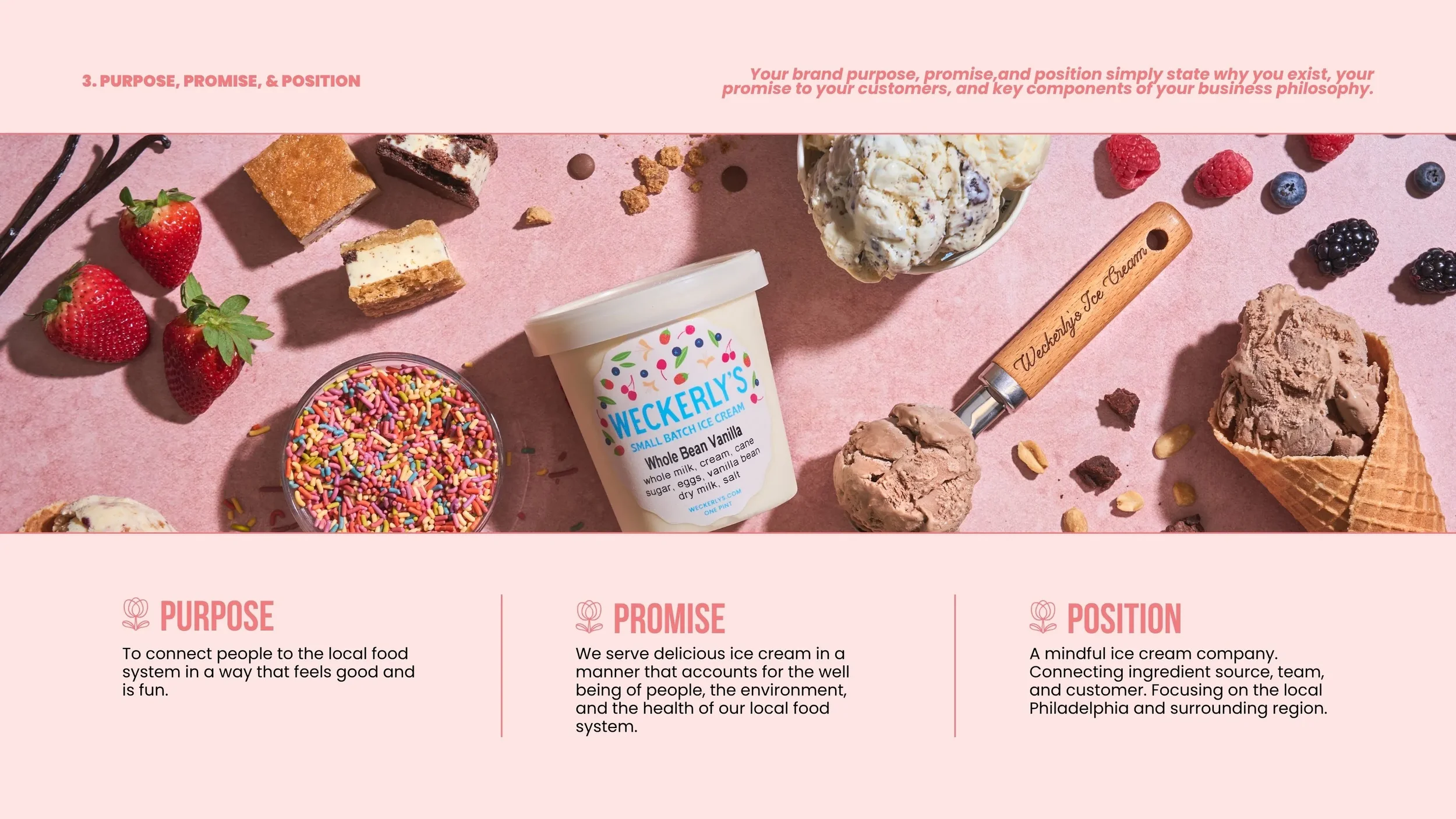 Pink was retained from the previous palette to maintain brand recognition and warmth. Green was introduced to balance the palette with natural tones that reflect Weckerly’s handmade and ingredient-driven character. The blue tones were softened and reduced to create harmony with the Rittenhouse shop’s pink interiors and overall aesthetic.